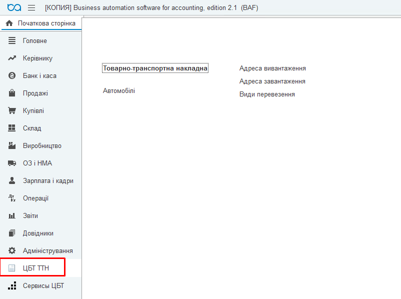 Модуль ЦБТ ТТН реалізовано як окрему підсистему, в якій зібрані необхідні довідники та документи для обліку та формування ТТН: