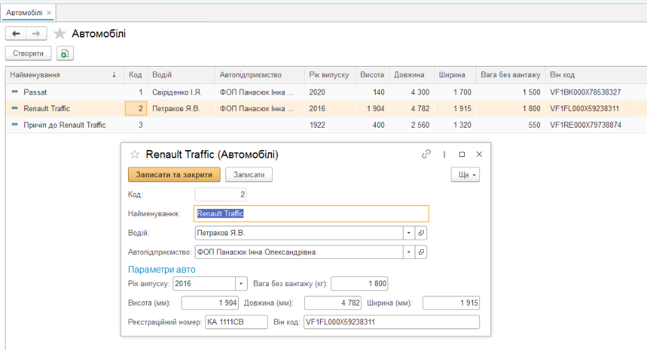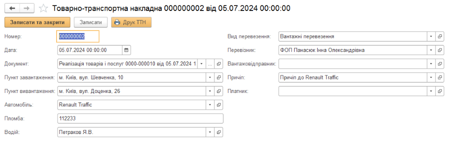 Водій та Перевізник заповнюються по замовчуванню по даним карточки обраного автомобіля, але їх можна змінити на даному етапі безпосередньо в самому документі.