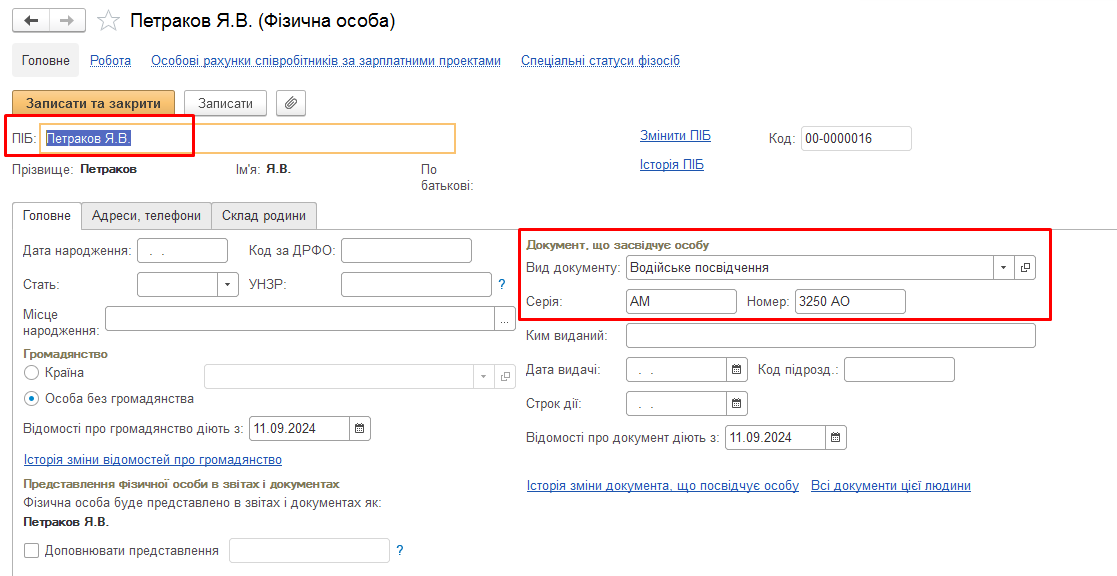 Дані про водія ведуться в довіднику «Фізичні особи» (доступ із карточки автомобіля або через меню Зарплата та кадри – Довідники та настройки – Фізичні особи):