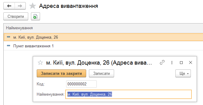 Довідник «Адреса вивантаження» - для зберігання інформації про адресу доставки: