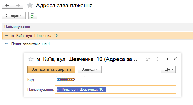 Довідник «Адреса завантаження» - для зберігання інформації про адресу складу, на якому відбувається відвантаження товару зі складу: