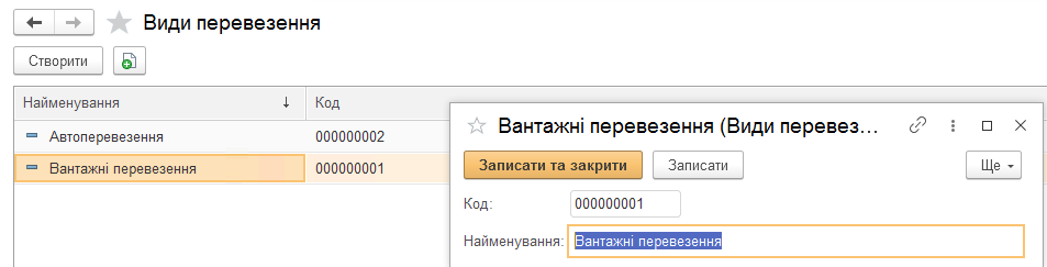 Довідник «Види перевезення» - для зберігання інформації про можливі види перевезення: