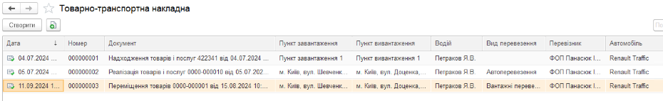 Документ «Товарно-транспортна накладна» - містить перелік всіх ТТН, що були сформовані та збережені в обліковій системі.