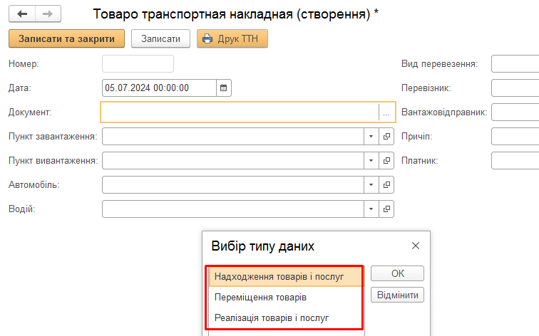 Модуль дозволяє формувати ТТН для таких типів документів: