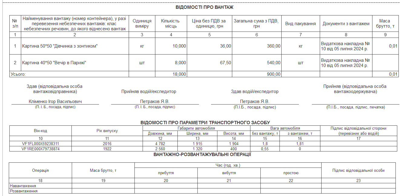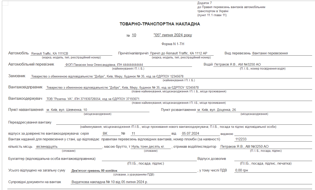 Введення в окремому документі даних про вантаж, відправника, отримувача, транспортний засіб та водія, маршрут та умови перевезення