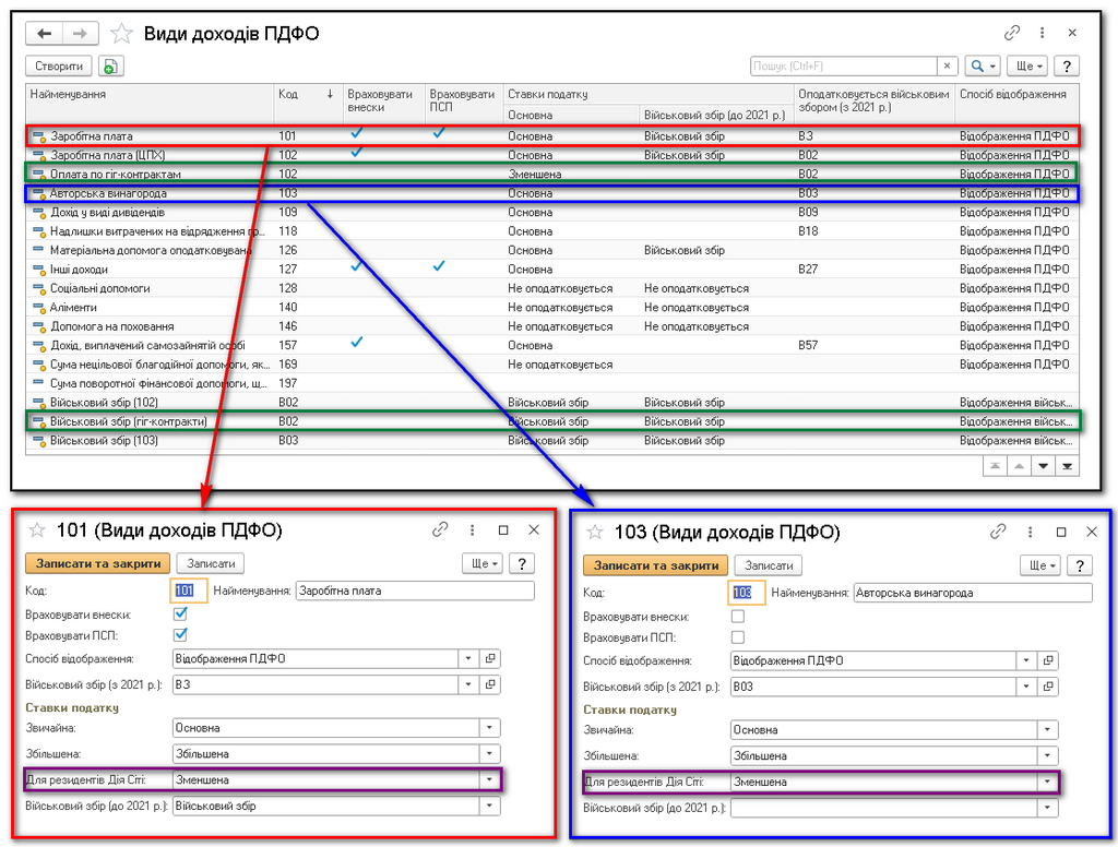 У програмах BAS для резидентів Дія Сіті та гіг-контрактів передбачені спеціальні налаштування для зменшення ставки ПДФО до 5%. Для цього в довіднику «Види доходів ПДФО» потрібно додати окремі реквізити, що враховують знижену ставку для доходів по гіг-контрактах (код «102») та військовий збір (код «В02»).