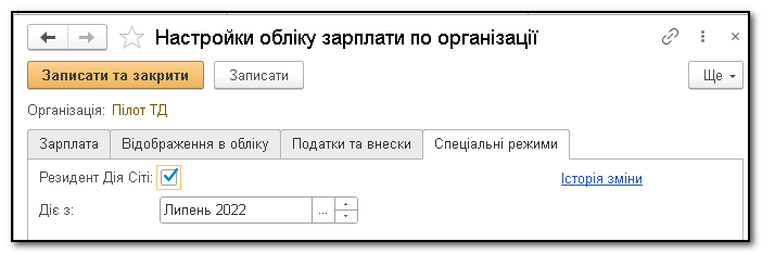 Для організацій, що є резидентами Дія Сіті, потрібно налаштувати період застосування цього статусу в програмі. Це налаштування доступне в BAS Бухгалтерія та BAS Зарплата та управління персоналом. Вказівка цього періоду важлива для правильного розрахунку зарплати та нарахування податків. У налаштуваннях обліку зарплати визначається зменшена ставка ПДФО, а також максимальний поріг для ЄСВ, що становить мінімальну заробітну плату.