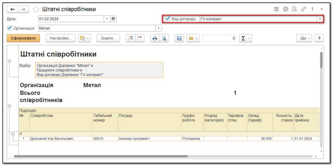 У BAS Зарплата та управління персоналом та BAS Бухгалтерія додано можливість фільтрації звітів за видом договору співробітників (трудовий договір або гіг-контракт). Це дозволяє чітко відокремити дані по працівниках за різними типами контрактів в звітах, таких як «Штатні співробітники» та «Розрахункова відомість».
