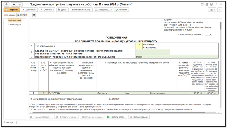 Зображення 7: Заповнення регламентованого звіту «Повідомлення про прийом працівника на роботу»
